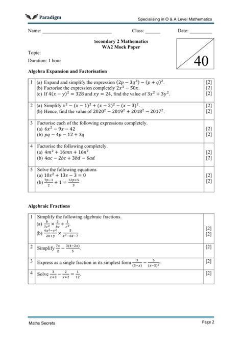 secondary 2 math worksheets